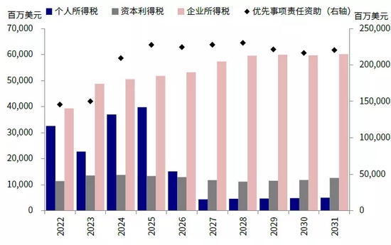 图表32:个人所得税、资本利得税、及企业所得税率调整带来的未来10年财政收入预测