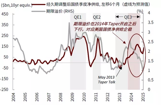 根据QE1-QE3阶段的经验,剔除美联储购债后的国债净供给与期限溢价具有明显的正相关性,说明国债净供给增加会导致债券价格下降,继而推高期限溢价。