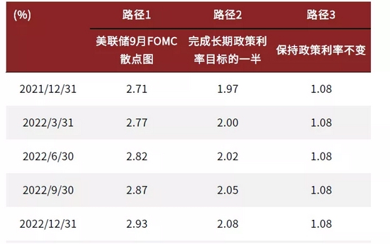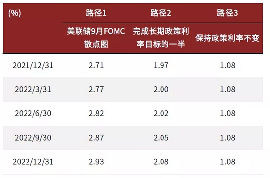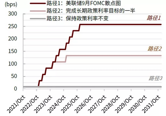路径1:美联储按9月份散点图指示节奏加息。2022年加1次息,2023年加3次息,2024年加3次息。参考美联储上次加息周期节奏,我们假设美联储2025年再加3次息,随后将政策利率保持在当前长期政策利率目标2.5%。