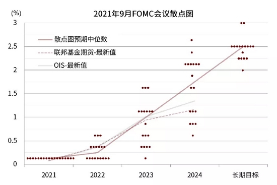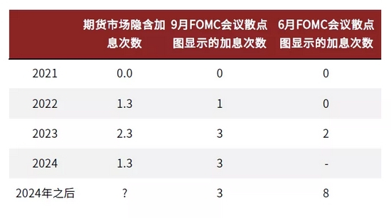 图表:市场对加息路径的预期vs 美联储的9月份散点图显示的加息路径