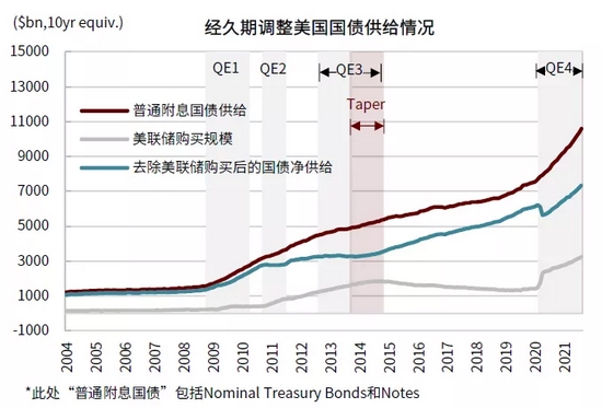 图表:美国国债的供给与QE购债需求都在不断变化(图表中为Nominal Coupon Treasury的供给需求量,已换算为久期相当的10年期国债量)