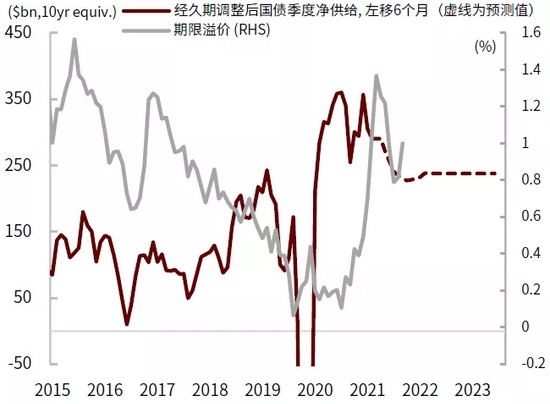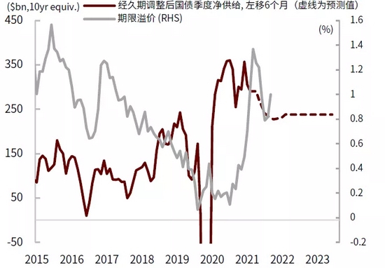 图表:久期调整后的附息国债净供给将在2022年上半年下行。期限溢价当前点位可能已经相对合理,Taper或已被市场充分预期