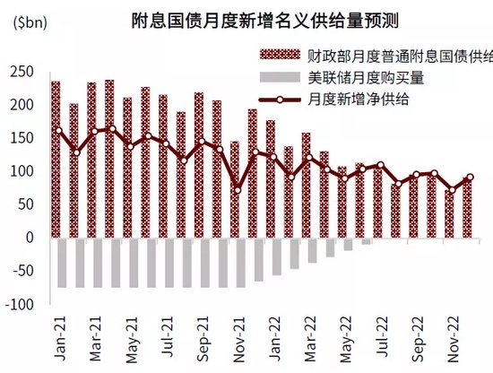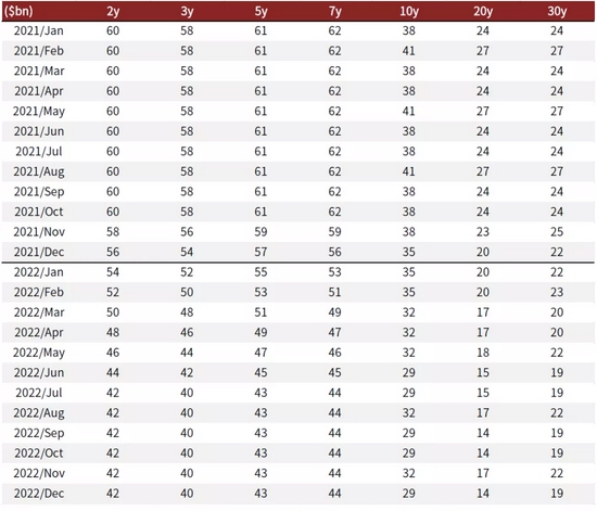 我们预期财政部将从今年11月起,每月分别减少2年期、3年期和5年期国债供给各20亿美元,减少7年期和10年期国债供给各30亿美元,减少20年期国债供给40亿美元,减少30年国债供给20亿美元(附息国债供给预测详见附录1)。根据我们对附息国债供给的预测计算,2022年普通附息国债(Nominal Notes,Bonds)发行量将比2021年同期减少9000亿美元左右,可以把零息债券占总国债市场比重保持在15%-20%。