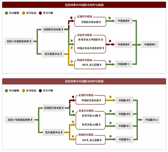 我们构建了一个系统分析框架(详见主题报告《美债利率如何影响中国市场》),全面剖析了美债利率影响中国股市和债市的宏观传导渠道,资金传导渠道,和情绪传导渠道。我们推导出每条渠道的传导方向和强度,加总不同渠道影响可得美债利率变动对中国市场的净影响。