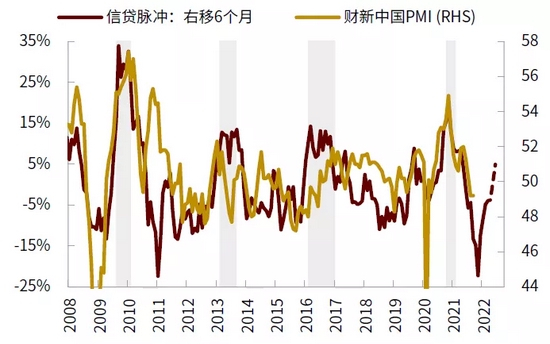 图表:信贷脉冲领先中国PMI 6个月左右,说明从信用扩张到实体经济增长的传导存在时滞