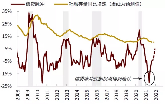 图表:虽然社融存量同比增速微降,但信贷脉冲继续上行,表示信用边际宽松