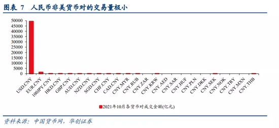 二则,9月以来的背离是什么情况?根据内外盘联动框架,美元兑人民币中间价变动+CFETS变动=外盘各币种变动加权值。今年9月以来,外盘整体呈现升值2.2%,其中美元指数升值3.5%,人民币汇率本应有贬值压力,但由于9月以来中间价走强,最终一篮子CFETS指数上涨达5.4%,一篮子升值幅度大于外盘升值幅度(4.8%)。在我国实际货币对定价中,中美中间价依然是核心,比如人民币兑日元汇率是中美中间价确定后,再考虑即期的美元兑日元汇率,再得到人民币兑日元汇率。直接交易非美货币对的交易量依然有限,人民币兑美元依然是外币交易的核心市场。
