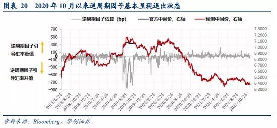 政策面,近期汇率走势完全由市场决定,央行并未有政策引导,也不是导致本轮汇率走强的推动因素。自从2020年10月逆周期因子宣布完全淡出中间价公式后,我们估算的逆周期因子基本围绕在±50bp以内波动,呈现退出状态。