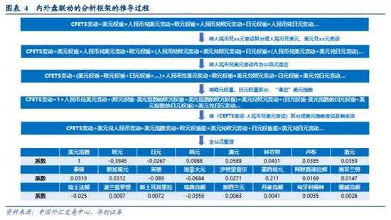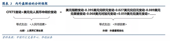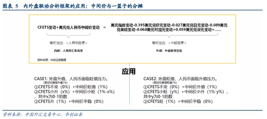 根据CFETS指数编制公式,可以推导出“内外盘联动分析框架”,即CFETS变动+美元兑人民币中间价变动=外盘各币种变动加权值。基于这一框架需要有两方面理解: