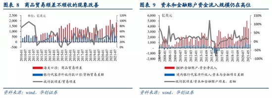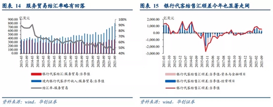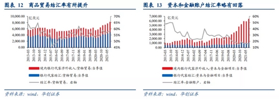 一则,今年“顺差不顺收”的现象有所改善,导致贸易与投资顺差实际形成的外汇流入更多,可流入银行体系的外汇资金提升。商品贸易层面,2021年1-9月,海关口径商品贸易顺差4260亿美元,银行代客涉外收付款顺差2140亿美元,占比达50%,而2020年全年贸易顺差5240亿美元,银行代客涉外收付款顺差2050亿美元,占比仅39%,可见今年商品贸易层面的顺差收款额比例显著提升。资本和金融账户层面,2021年1-6月,BOP口径金融账户净流入8569亿美元,银行代客涉外收付款顺差1273亿美元,占比达14.9%,而2020全年,BOP口径金融账户净流入11288亿美元,银行代客涉外收付款顺差1631亿美元,占比达14.4%,可见今年资本和金融账户的收款额比例保持稳定,且金额仍在历史高位,支撑外汇继续大规模流入。综合来看,今年Q1-Q2银行代客收付款顺差持续突破600亿美元,Q3小幅回落至460亿美元,处于历史峰值,反映今年外汇资金实际流入规模较2020年进一步走阔。