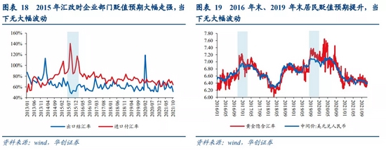 汇率的“偏离程度与纠偏力量成正比”为此次会议新提法,即无论是升值还是贬值,一旦由于交易因素或者预期因素过度偏离基本面,事后都会面临市场自发的纠偏力量或者政策纠偏力量,偏离越远,纠偏越大。可以看到,在2015年汇改时企业部门贬值预期大幅走强,2016年末、2019年10月汇率破7预期升温时居民部门贬值预期大幅走强,而在2018年10月中美贸易摩擦升级时市场交易情绪显著放大(见图表8-10)。而在这几轮市场预期与情绪大幅波动后,汇率很快触顶回落,且纠偏幅度较大。