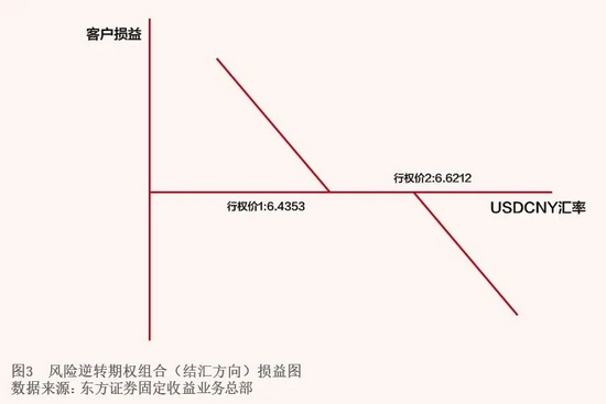 如某服装加工类出口型企业,年收汇额为5亿—8亿美元。受2021年原材料价格上涨的影响,企业利润率压缩,盈利压力较大。企业希望一方面能够降低汇率波动对企业盈利的影响,另一方面也能够将期权费用控制在一定范围,以降低公司整体运营负担,保有盈利空间。为此,企业通过区间波动型期权,将自身的净敞口锁定在一定区间之内,具体选择了风险逆转期权组合产品。该组合包括买入1倍美元看跌期权,此时行权价为美元兑人民币6.4353(设为行权价1);卖出1倍美元看涨期权,此时行权价为美元兑人民币6.6212(设为行权价2),期限3个月。到期日,若美元兑人民币市场价格在执行价1和2之间,企业按照市场价格结汇;若市场价格在行权价1的上方或者行权价2的下方,则按照行权价1或行权价2来结汇(见图3)。使用该产品,无论汇率如何波动,企业的汇率敞口始终锁定在行权价1和行权价2的目标区间内,对市场风险实现了较好的保护,企业也基本实现了风险中性。同时,企业不需要先期支付期权费,对比主动避险型期权企业需支付1000pips以上的期权费,节省了财务成本。