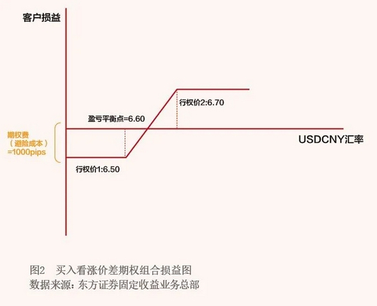 上述单纯买入普通看涨或者看跌期权的劣势在于,期权费支出相对较高。对此,如果企业希望既能够进一步掌握避险主动权又能降低期权费支出,则可以买入期权组合来实现这一目的。例如,企业如果想降低期权费,可以选择看涨价差型期权组合。具体操作如下:买入1倍看涨期权和卖出1倍看涨期权。如企业买入1年期执行价为美元兑人民币6.50的看涨期权,同时卖出1年期执行价为6.70的看涨期权。期权费为1000pips,相比单纯买入看涨期权可以节省980pips。到期时,美元兑人民币即期汇率在6.50—6.70之间,企业可以选择差额交割,对冲市场风险;若市场价格在6.70上方时,企业收取2000点补贴,即6.70与6.50的差额(见图2)。虽然不能够完全对冲美元上涨风险,但是可以在锁定汇率风险的基础上,进一步有效降低期权费,减少企业财务成本。