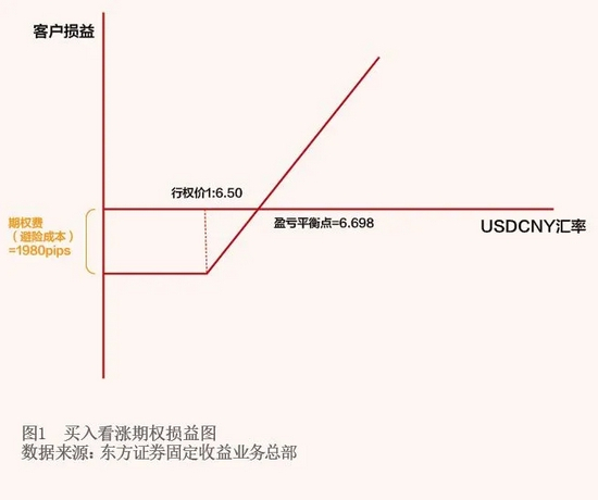 以某上市航空公司为例。该公司一般在会计科目上以上一年度最后一个交易日的收盘汇率作为基准汇率用于核算下一年度购买飞机的成本。对此,企业管理汇率风险的策略是通过远期购汇锁定50%的敞口。2018—2019年,美元兑人民币涨幅超过4800点,该航空公司财务年报显示其汇兑损益科目亏损超过3000万元。鉴于投资者和股东对于公司利润表的关注,该航空公司迫切希望找到新的汇率避险工具,能够降低汇兑亏损或完全规避市场风险。对这种情况,企业可考虑主动避险型期权,在每年年底做财务预算时,划拨部分财务费用专门用于第二年购买外汇期权。具体操作如下:假设企业的成本汇率为美元兑人民币6.50,企业每年的购汇总量为1亿美元,企业购买1年期执行价为6.50的看涨期权价格为1980pips。在该假设下,锁定全部敞口,成本最多为1980万元。如果年末美元兑人民币即期价格在6.50上方,则企业可用美元兑人民币市场价与执行价进行差额交割,可完全对冲美元的上涨风险;如果年末美元兑人民币即期价格在6.50下方,则企业可选择不行权,以实时市场价格购汇(见图1)。无论上述哪种情况发生,企业会计账目上汇兑损益科目均为零,而期权费可记为公司财务费用。该汇率避险方式相当于企业每年年初通过支出固定的财务费用,给自身汇率敞口购买了一笔“保险”,保护汇兑损益科目不出现亏损,而“保费”就是期权费。