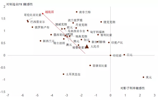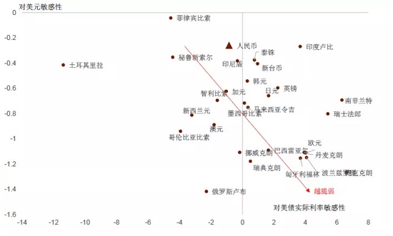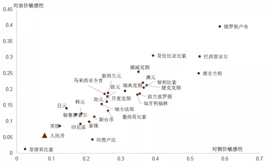 在明年全球增长放缓、美元流动性收紧的背景下,哪些外汇最受伤?根据我们的敏感性分析,哥伦比亚比索、巴西雷亚尔、南非兰特、俄罗斯卢布、欧元及东欧货币最受伤,而人民币、印尼盾、菲律宾比索和日元的风险暴露程度相对较小。同时,面对明年美元走强(至少上半年)和美债实际利率上行,欧元、东欧货币、巴西雷亚尔最受伤,而人民币和菲律宾比索较不敏感。最后,面对油价和价的涨跌,俄罗斯卢布、南非兰特、哥伦比亚比索以及巴西雷亚尔最为敏感,而人民币和菲律宾比索较不敏感。综上,我们发现人民币在面对外在风险因子时,其风险暴露程度均较低。