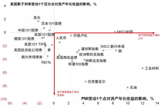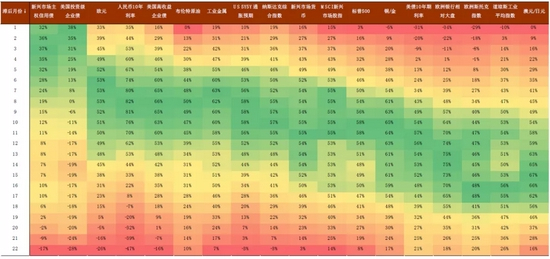 注:图中数字为滞后相应月份的信贷脉冲12个月变化与资产价格(或指数)12个月同比变化的相关系数,10年期美债利率使用12个月变化