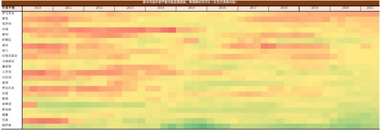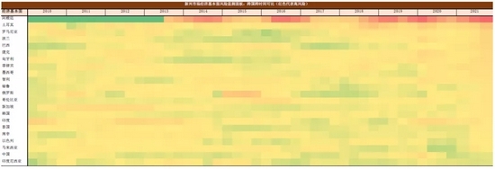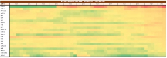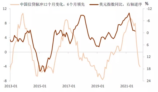 变数之一是中国信贷脉冲。在《全球大类资产之一:宏观逻辑、轮动体系和供给冲击》中,我们指出中国信贷脉冲通过拉动全球经济周期而领先全球大类资产平均一年左右(见图表10)。具体来说,当中国信贷脉冲确立上行4-6个月后,美元开始承压(见图表11)。从图表12的热力图可以看出,中国信贷脉冲一旦确立,4-6个月后欧元显著走强,对应美元走弱。我们知道历史上,中国信贷脉冲每2-3年一轮周期,与中国的经济周期错位平行,上一轮信贷冲起于2020年3月,按照历史规律下一轮可能开启于2022年上半年,假设下一轮信贷脉冲上行幅度能与历史上幅度可比,那么美元或在下半年开始承压,或者美元上行势头得到一定抑制。