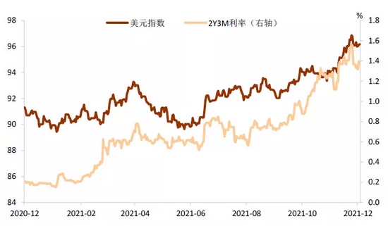 自6月美联储议息会议以来,美元在不断升温的加息预期推动下趋势走强。展望2022年,我们认为通胀风险引致的震荡升温的加息预期、全球增长放缓、以及美元流动性收紧将构成美元强周期的铁三角,推动美元指数在未来几个月进一步走高。然而,相较于其它发达国家,美国更有粘性的高通胀对美元指数形成的弱趋势,以及市场已较充分定价的加息预期,可能使得美元上行空间有限。