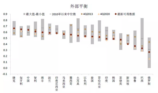 前文提到,汇率压力更多由经济基本面和外部平衡两大板块决定。图表42显示了在这两大维度下,哪些国家的外汇可能面临较大调整压力。具体而言,东欧国家、土耳其、阿根廷面临较大压力,而新加坡、秘鲁、俄罗斯、印度尼西亚面临则较小压力