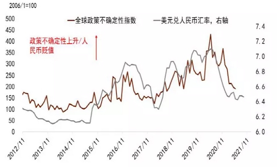 第二,人民币的风险溢价没有出现大幅波动,疫情以来低位运行。作为第一大贸易国的货币,人民币市场的情绪还是受到国际关系和地缘政治的影响。今年中美关系边际上并未继续恶化,美国高官访华、并促成了中美两国元首的视频对话,投资者对未来中美在经贸合作上出现一些新的进展有所期待。此外,与部分其它新兴市场和发达国家糟糕的疫情应对不同,中国疫情管控的效果非常突出,并未出现大规模的疫情反复。因此,2021年全年人民币的风险溢价也处在一个大体平稳且低位运行的状态,这与2018-19年中美贸易摩擦时人民币持续具有较高风险溢价形成鲜明对比。