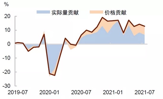 得益于疫情管控良好与供应链的稳定,今年中国出口持续保持强势。今年以来,中国出口持续保持较快增长,1-10月出口同比增速达到32.3%、两年平均增速达到15%。2021年1-9月,中国贸易顺差合计5106亿美元,相比2019年同期的2943亿美元大幅提高。与全球贸易增长主要由价格带动不同(价格因素贡献80%),中国出口中量与价对增速的贡献大约各占50%。此外,分行业来看,2021年上半年中国在高附加值行业的出口份额相较2020年下半年仍在提高,制造业价值链持续上移,意味着相对生产力的提升。根据巴拉萨-萨缪尔森理论,人民币实际汇率得到升值,在CPI通胀温和可控(尤其相较于美国)的情况下,转化为名义汇率的强劲。