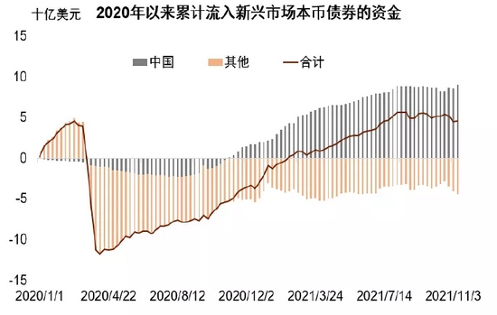 另一方面,中国国债吸引力不断上升,吸引资金持续流入。今年以来,境外机构累计增持中国国债达到4258亿元,仍然明显高于疫情前水平。此外,EPFR的数据显示,中国本币债券市场在新兴市场国家中“一枝独秀”,疫情以来,外资净流出其他新兴市场国家的债市,但是净流入中国国债市场。在这背后,我们认为中国国债的吸引力出现了结构性的提高: