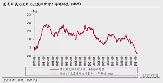 二是购买力平价理论在较长期限内似乎仍有效。名义汇率与PPP的价差会逐渐收敛,但周期的长短并不稳定,长则数十年,短则数年,呈现非线性特征。尽管20世纪下半页以来,每次偏离都是相近的幅度,周期却有所缩短。此时,美国已经是世界上最发达的国家,美元的世界霸权已经建立。尤其是1980年代以后,新自由主义经济全球盛行,中国加入世贸组织极大提高了商品供应能力。伴随着贸易成本快速下降,英美两国的通胀差异在过去三四十年几乎可以忽略不计(见图表7)。从1980年代至今,贸易力量和金融力量的此消彼长,加上主要经济体通胀趋同且持续下降,是PPP理论失去吸引力的重要原因。以日本为例,由于货币政策在可预见的时间内将保持低利率,名义汇率波动从1980年代开始持续下降(见图表8)。这不仅会影响PPP走势(由于通胀差异减少,更难以判断),也会降低名义汇率超调的概率。对于“特殊”发展中国家的中国来说,PPP理论仍有值得借鉴的地方,但是不能脱离我国的现实背景。我国在经济和金融实力上升过程中逐渐出现与发达国家相似的特征,即在可预见的未来我国利率趋于下行【6】,人民币名义汇率的升值压力可能会不断下降,而低通胀又会导致PPP贬值难度越来越大,收敛时点和方式就更难以估测。