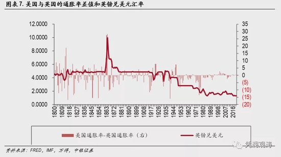 一是中短期内,绝对平价购买力难以完全维系,时常背离。除了19世纪中期以外,美元在19世纪大部分时间里持续高估,最高达到68.7%;从20世纪初至二战结束,美元逐渐取代英镑成为世界货币,但美元持续低估,并非使用强势货币政策来取代英镑,更像是为贸易战服务;二战结束后,贸易和金融全球化导致美元对英镑的偏离周期显著缩短(次数明显增加)(见图表6)。而且,周期性背离不仅发生在浮动汇率时期,固定汇率时期也同样出现(见图表7)。19世纪,英国是世界霸主,美国尚处于工业化建设阶段。大部分时间内,美元是紧盯英镑的。19世纪美元高估的收敛基本上依靠的是美国更为强烈的长期通缩(自身价格下降)。而20世纪后半段至今,汇率的自发调节或超调更加突出,通胀对价差的影响似乎也有所下降,英镑受欧债危机和脱欧影响表现疲软。例如近10年,美国通胀更高,美国商品价格更贵。按照购买力平价理论,英国会增加对美出口和贸易顺差,引发英镑升值美元贬值,促使两者通胀收敛。但实际上,英国是美国少有的对外贸易顺差对象国,英国比美国更缺乏商品生产能力。虽然不少人认为美国债务不可持续(短期不会出现美国政府信用危机)和美元被高估,但现行经济环境下高通胀反而成了好事,鲜有成为贬值的理由。