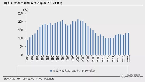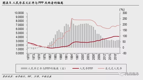 购买力平价理论的本质是国家之间的货币供需差异,而商品价格或通胀水平更多体现的是媒介作用【7】。作为发展中国家,我国维持略高于发达国家的通胀水平应是合理的,而更高的货币增速配合经济增速也是正常现象。只不过,近年来我国的通胀较为低迷,导致IMF计算的PPP趋于走平(见图表9)。