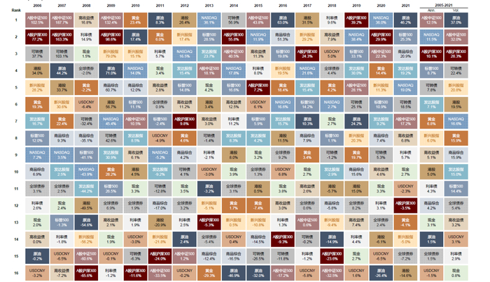 *现金:2014年及以前使用1周期银行理财收益率年均值,2014年以后使用余额宝7日年化收益率年均值;利率债:中债总财富指数;高收益债:中债企业债AA总财富指数;可转债:中证转债指数;全球债券:JPM Global Aggregate Bond,调整为人民币计价;A股沪深300:沪深300全收益指数;A股中证500:中证500全收益指数;港股:恒生指数,调整为人民币计价;发达股指:MSCI DM TR Index,调整为人民币计价;USDCNY:美元兑人民币汇率变化,正值代表投资美元资产的汇兑收益;原油:布伦特原油价格,调整为人民币计价;黄金:伦敦金现货价格,调整为人民币计价。数据截至2021年12月31日。