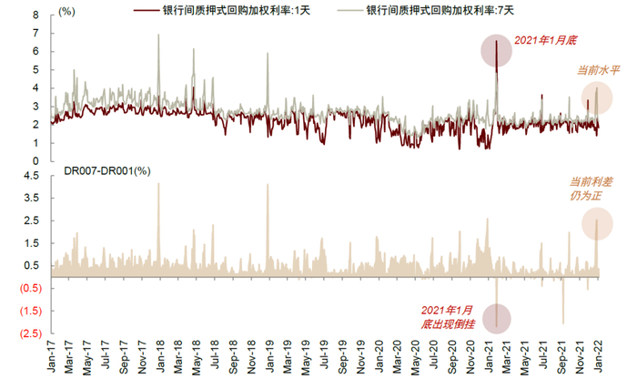 图表9:2021年1月银行间流动性紧张,DR001和DR007骤升