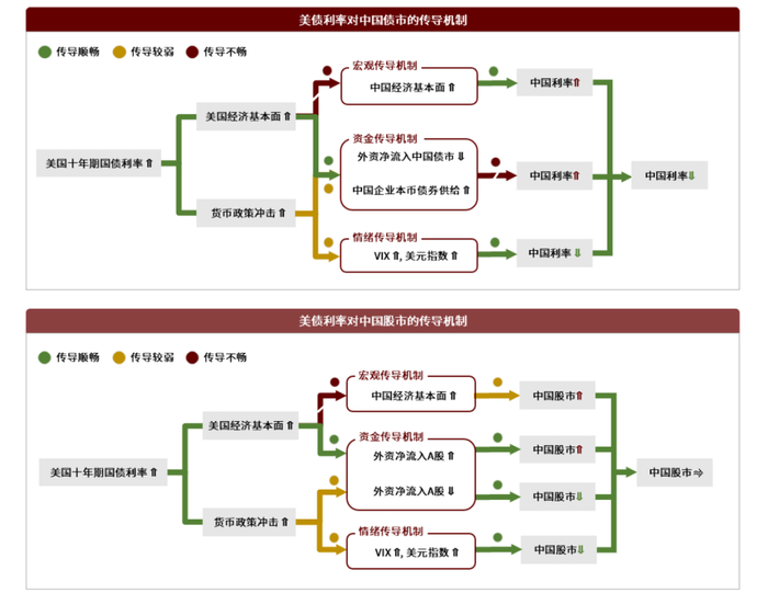 我们在主题报告《美债利率如何影响中国市场?》中建立了一套系统性框架(图表11),分别测算了美债利率通过宏观、资金、情绪3种传导渠道对于中国股、债市场的影响方向和强度。加总不同传导渠道的影响,可以得出美债利率变动对中国资产的净影响。