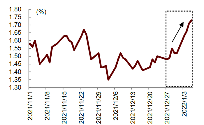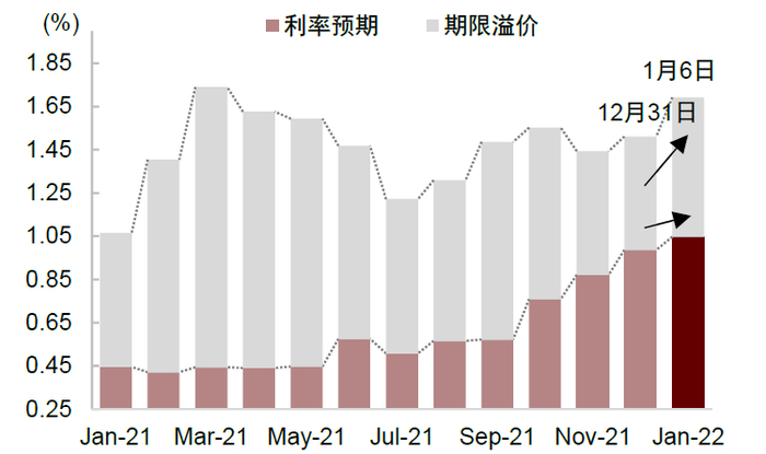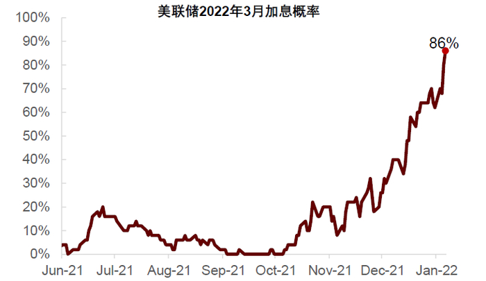 美联储“缩表”信号推高美债长端利率 :12月FOMC会议纪要(1月6日公布)显示,参会官员对“缩表”问题展开充分讨论。部分参会官员认为,提前“缩表”推高长端利率,有助于收紧流动性、控制通胀,同时避免利率曲线过于扁平化。会议纪要明确提示本次“缩表”与首次加息的时间间隔可能会比上次紧缩周期短,原因在于本次加息周期的宏观环境与上次加息周期明显不同。我们认为“缩表”时点提前与加息节奏前置逻辑相通,都是美联储面对空前通胀压力的被动选择,是“非典型”加息周期的具体表现。我们再次提示,本次美国政策收紧周期比较特殊,历史归纳法的作用相对有限,预测市场走势需要根据本次紧缩周期的“非典型”特性进行演绎分析:本次加息周期启动时点提前,节奏前快后慢,Taper、加息、与“缩表”的时间间隔明显缩短,或对美债利率形成持续推力。根据“利率预期+期限溢价”分析框架,我们预期十年期美债利率2022年震荡上行,年底升至2.1%;期限溢价计入过多悲观预期,调整空间较大。最近十年期美债利率上升超过20bp(图表1), 期限溢价调整贡献~10bp(图表2)。期货市场预期2022年加息次数已经超过3次(图表4),同时3月份加息概率已经高达86%(图表3),市场对2022年加息节奏可能已经定价比较充分。如果近期美国经济数据不及预期或疫情反复,存在利率短期回调可能性,但美债利率上行大趋势不会改变。