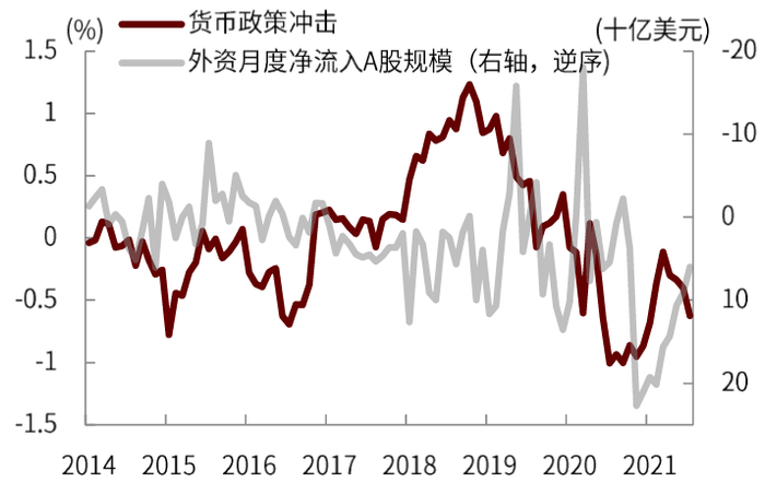图表15:如果美债利率上升反映“货币政策冲击”,A股外资净流入减少,但关系相对较弱