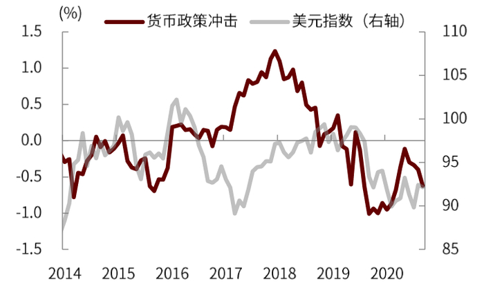 图表16:美国货币政策冲击往往引发美元指数上涨,但关系较弱…