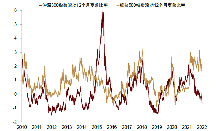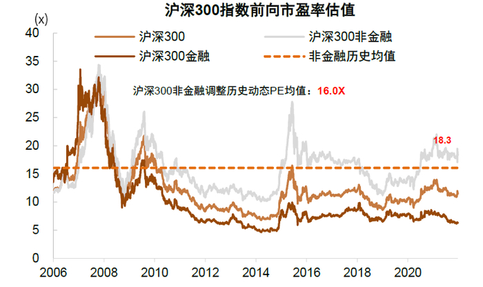 从2020年3月至2021年初,沪深300指数累计涨幅超过60%,十年期国债利率同期上升70bp,导致股票相对债券估值过高。2021年初,风险溢价压缩至2.5左右,提示2021全年股票可能明显跑输债券(图表7)。股票估值偏高导致市场对负面冲击较为敏感,最终在美债利率骤升催化作用下开始“中期调整”,2021年沪深300指数仅录得-5%回报,相对债市的超额收益为-10%。进入2022年,市场估值水平与2021年初相比发生明显变化,目前A股估值整体已经较为合理,风险溢价提升至4.4,反映2022年股票可能明显跑赢债券。从市盈率角度看,当前A股整体估值位于历史均值附近(图表8),但低于海外主要市场。估值优势可能减少中国股票对海外流动性收紧的下调空间,增加对中国“稳增长”政策支持的上涨空间。