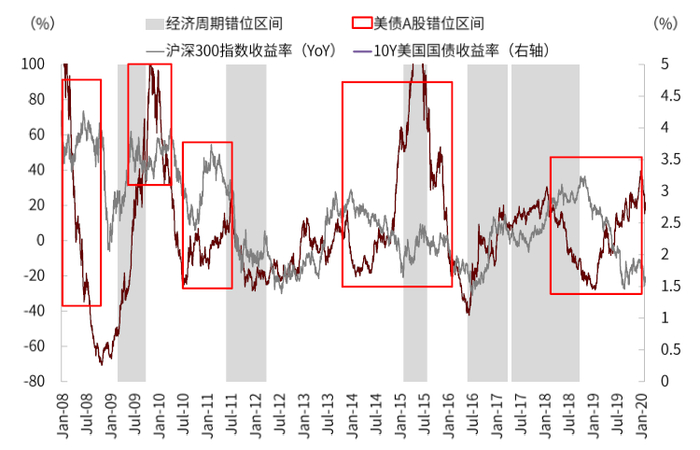 图表13:美债利率与A股走势背离与中美经济周期错位关系不大