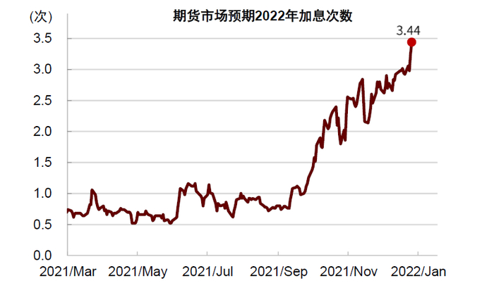图表4:期货市场反推的2022年加息预期已经超过3次