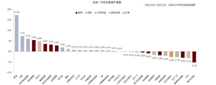 12月全球大类资产表现整体排序为:商品>海外股票>黄金>中国债券>中国股票>海外债券。12月市场交易主线由疫情向政策转移,国内中央经济工作会议定调“稳增长”, 中国人民银行于12月宣布降准并调降LPR1年期利率,货币政策的宽松引导利率出现下行,相反海外持续性通胀的压力下,美联储于12月FOMC会议上宣布加速Taper,散点图中上调2022年加息预期至3次,流动性的收紧导致美债利率快速上行。在国别配置上,虽然发达市场跑赢中国市场,但或更多体现发达市场11月回撤后的估值回调。综合11月-12月表现,以及资产的收益率与波动性,中国资产仍然占优。最后,受益于国内“稳增长”政策与疫情担忧边际缓解,商品价格全月震荡上行。细分资产来看: