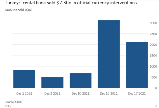 土耳其央行在2021年12月五次干预外汇市场,总计抛售73亿美元的外汇储备,截至12月24日的一周,央行的净外汇储备减少了35.3亿美元,然而里拉汇率高涨仅仅维持了几天,土耳其里拉兑美元以五个交易日连跌逾20%结束了2021年。分析师警告,干预或将使捍卫货币的实际代价更高。