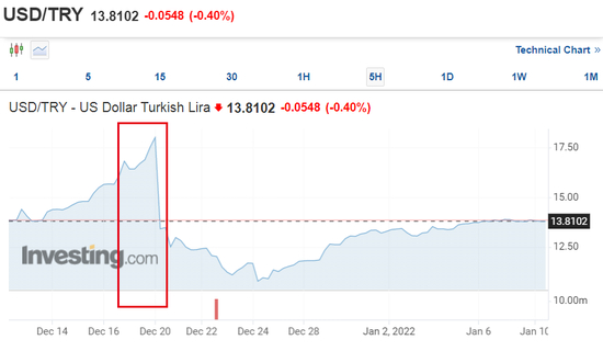土耳其为了“拯救”里拉,也是费尽心思,先是土耳其总统埃尔多安采取“奇招”,宣布政府将给里拉存款人补偿贬值损失;后有土耳其央行在2021年最后一天“变魔术”,一日之内资产负债表上多出100亿美元…不光如此, 据官方数据显示,去年12月,土耳其为支撑里拉花费了逾70亿美元的外汇。
