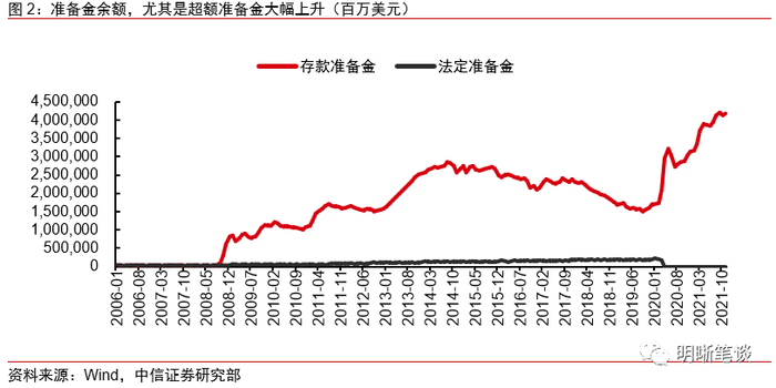 第二,需要缩表以避免大规模超额存款准备金的上升导致通胀的风险。由于大规模资产购买计划(LSAP)通过投放基础货币像市场释放流动性,导致美联储基础货币中准备金余额,尤其是超额准备金大幅上升。而在经济复苏前景较不确定的时期,银行并不会通过借贷向市场投放这部分流动性,但是当美国经济复苏态势明确后,银行贷款热情将被提振,这部分流动性将被货币乘数效应进一步放大后投放至实体经济,则势必会增加通胀的风险,因此需要通过缩表来大规模降低超额存款准备金。