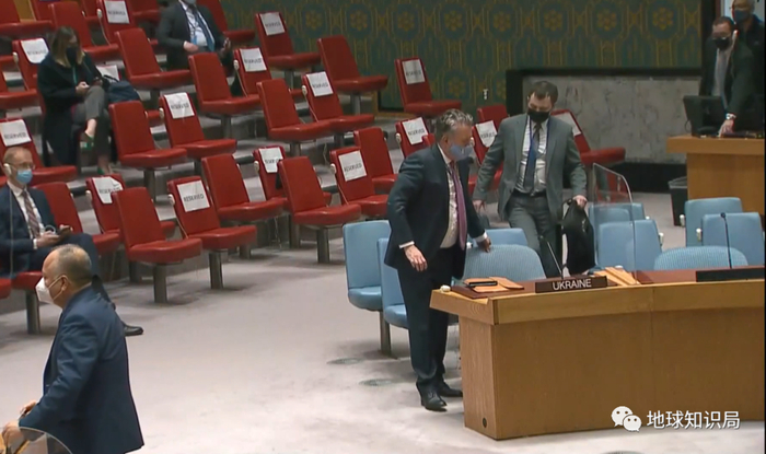 会议视频中耐人寻味的一幕,安理会本月轮值国是俄罗斯,其常驻代表都开始讲话了,乌方代表还坐在后方红椅子上,视频第50秒才有工作人员过来放了个铭牌,他才得已坐到会议桌末尾 (图:联合国会议视频)▼