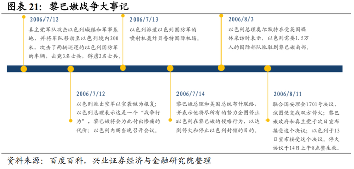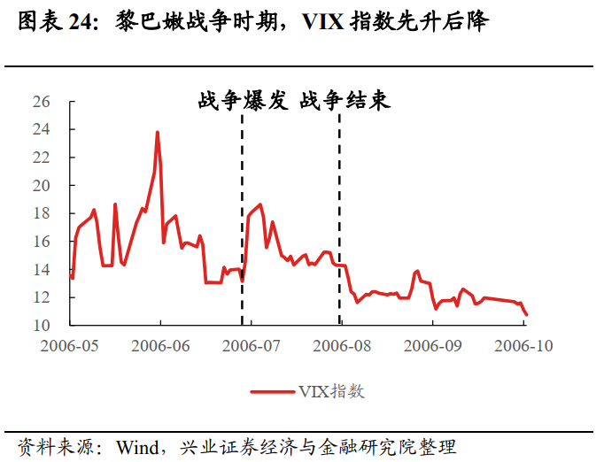 黄金:战争爆发初期黄金价格快速冲高,但后期有所回落。以黎冲突爆发后的5天内,市场恐慌情绪较严重,VIX指数涨超41%,资金纷纷涌入黄金,催化金价上涨1.37%。但是随着战争扩大的可能性趋小(7月14日,黎巴嫩总理西尼乌拉就和美国总统布什联络并表达停火意愿),市场恐慌情绪缓解,VIX指数下行,黄金价格同样有所下跌。