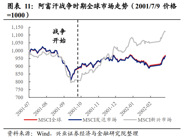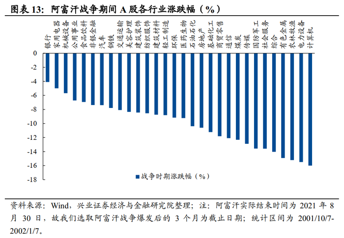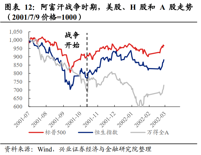 A股市场:阿富汗战争对A股有一定冲击,但彼时A股的下跌和反弹归因于多个外部事件的合力。阿富汗战争前的“银广夏”事件、“国有股减持”事件、“安然事件”和“911”事件的冲击,但阿富汗战争后第一个交易日,A股仍受到明显影响,单日下跌2.4%;战争爆发后,由于证监会叫停“国有股减持”、财政部降低印花税等一系列利好使A股有所反弹。结构上,银行股相对抗跌,电力设备、有色金属和计算机表现较差。银行股的超额收益或与其在下跌行情中凸显的防御属性相关。