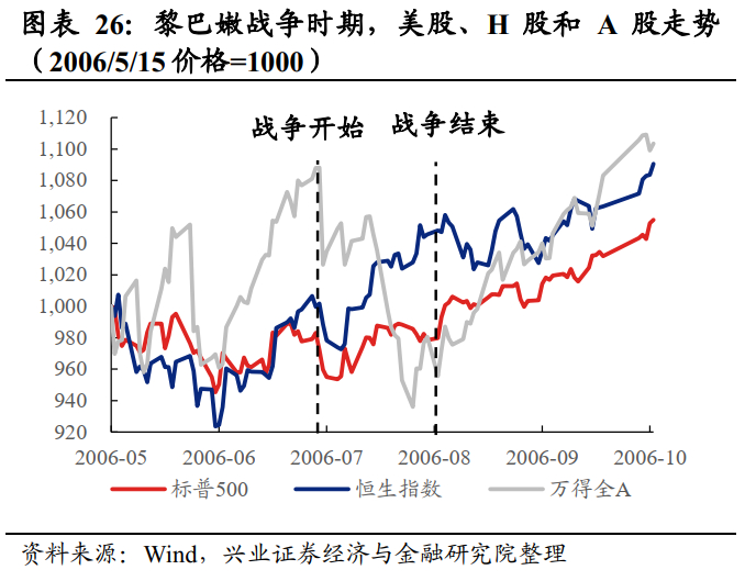 A股市场:整体上,战争对A股短期有冲击,但三大内生因素是导致A股于战争期间持续下跌的主要因素。黎巴嫩战争爆发当天,市场情绪遭受冲击,A股领跌全球主要股指,上证指数单日下跌超5%。但之后,受内生因素扰动,A股并未随全球股市股市回升。首先,06年5月重启的IPO稀释了市场上的流动性。其次,6、7月底央行两次宣布上调存款准备金率。最后,7月26日,国家税务总局宣布统一强制性征收二手房转让个人所得税。结构上,高增速、低通胀的经济环境使房地产、石油石化和银行相对抗跌。2006年净利润增速的上涨是银行股全年表现靠前的主要逻辑,石油石化行业的超额收益与该时期原油价格的上涨关联性较高,经济火热(2006年7-11月,房地产投资增速位于24%以上)叠加新会计准则(投资性房地产可使用公允价值计量),催化地产板块表现较好。
