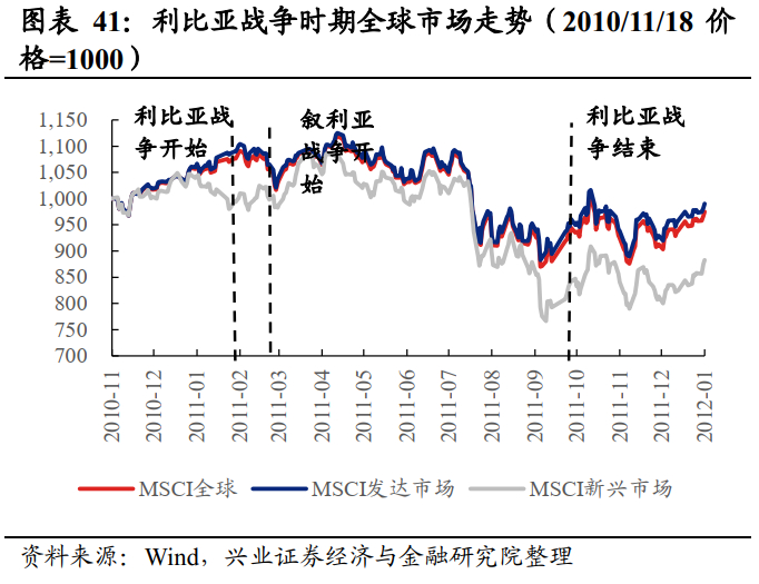 全球股市:(1)利比亚战争时期发达市场短期受挫,以A股为代表的新兴市场对战争的敏感性较低。利比亚多个城市开始出现要求政府下台的抗议活动,宣告利比亚战争的开端,随着战争的持续演绎,全球市场避险情绪抬升,资金开始流出“参战”的欧美国家股市,导致MSCI发达指数于3月中上旬有所下跌,期间最大回撤6.8%。相对而言,新兴市场较为抗跌。(2)叙利亚战争初期使全球股市下跌,叙利亚战争的爆发与早些的利比亚战争冲击下,权益资产有所下跌。