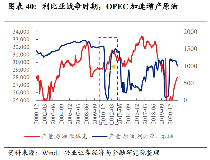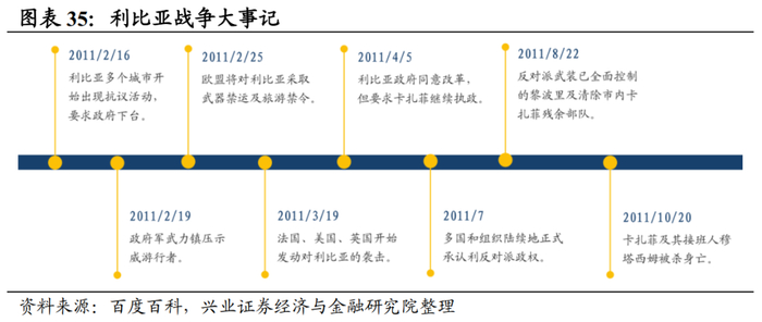 原油:利比亚战争&叙利亚爆发后,原油价格明显上行。利比亚方面,战争的冲击导致利比亚原油大幅减产,叙利亚方面,尽管叙利亚不是石油生产大国,但其靠近多条原油的输送管道和海上航线的出海口,对石油运输影响较大,因此利比亚战争&叙利亚战争爆发的短期内,出于对原油短缺的担忧,布油上快速上涨。但是,中长期,随着OPEC国家的增产,叠加世界主要原油消费国都已建立了石油安全保障体系,2011年5月起,布油回吐部分涨幅。