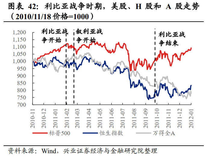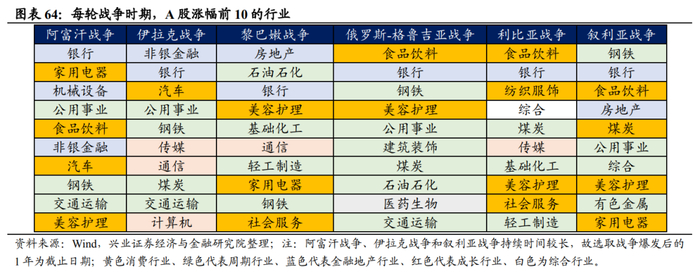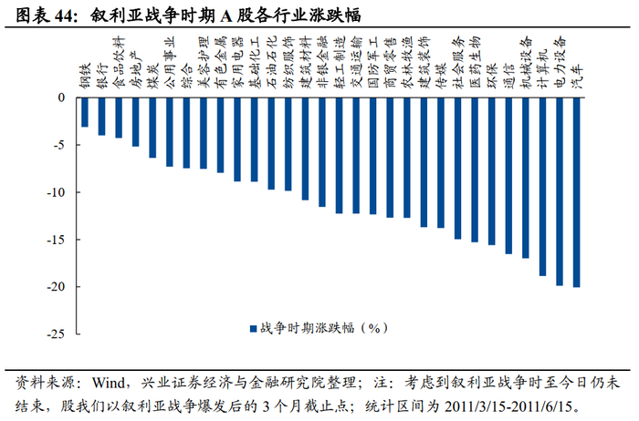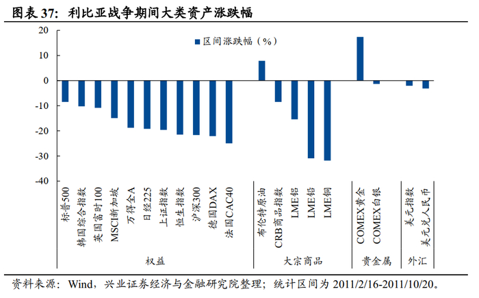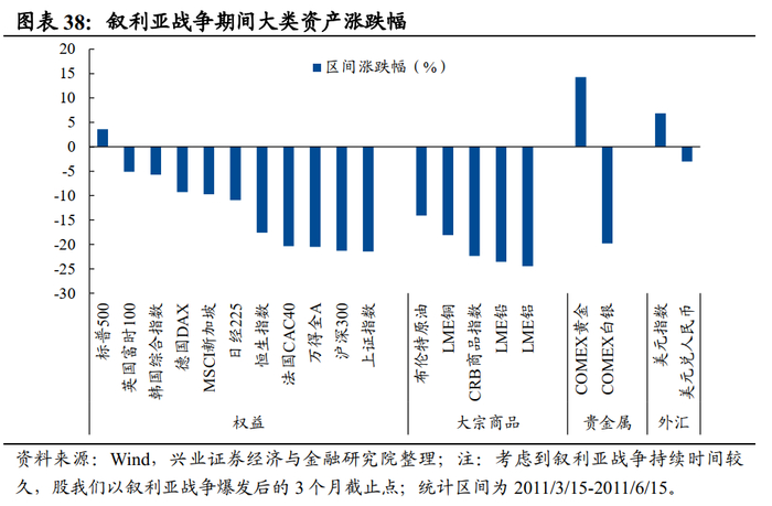 整体来看,利比亚战争期间,大类资产普遍表现较差,仅原油和黄金取得正向涨幅,权益类资产全面收跌;叙利亚战争期间,黄金、美元和美股表现较好。