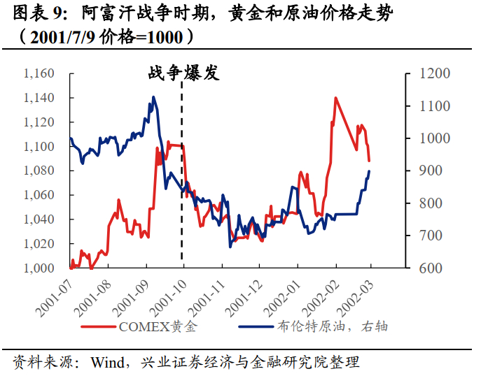 原油:阿富汗战争的爆发对原油价格的影响较小。由于阿富汗自身的石油资源不丰富,因此战争的爆发对全球石油供应量的冲击不显著。战争爆发后短期油价的持续暴跌在于全球经济减速引发的石油需求萎缩和前期增产较多导致的供需错位,而2002年以来油价的上涨则是受全球经济修复所带来的需求持续上升。